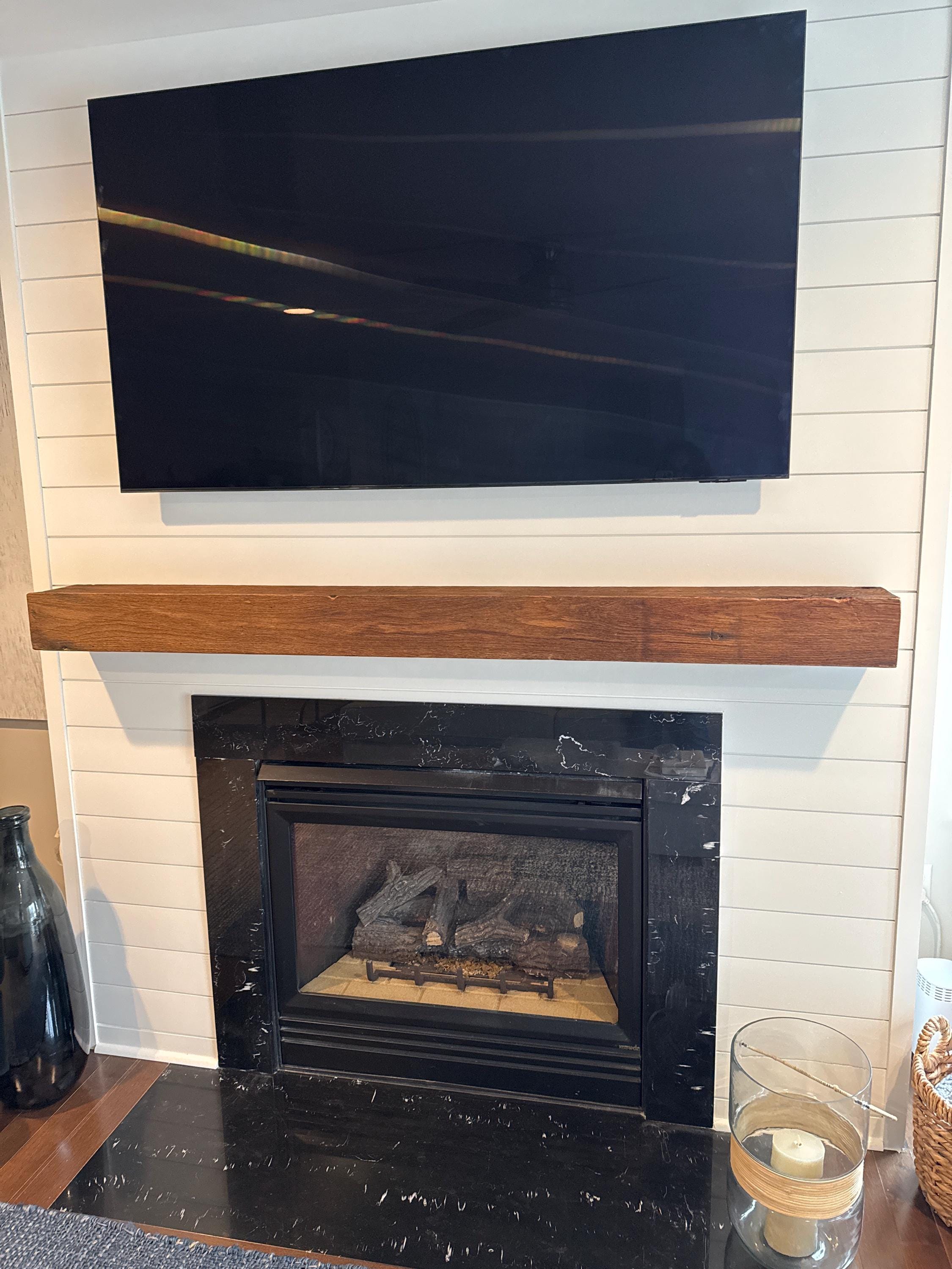 These floating mantels are created by skinning a plywood box with 1/2" thick boards. They are designed to easily slide over an existing mantel or as a lightweight option to create a mantel where one does not yet exist!